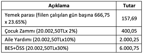 Prime esas kazançlardan istisna tutulacak yemek parası, çocuk zammı, aile zammı (yardımı) ve BES/Özel Sağlık Sigortası tutarları aşağıdaki gibidir;